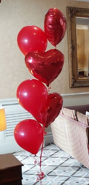 The set of 6 balloons display best set for floor height, balloons are helium filled and set on a weight.
